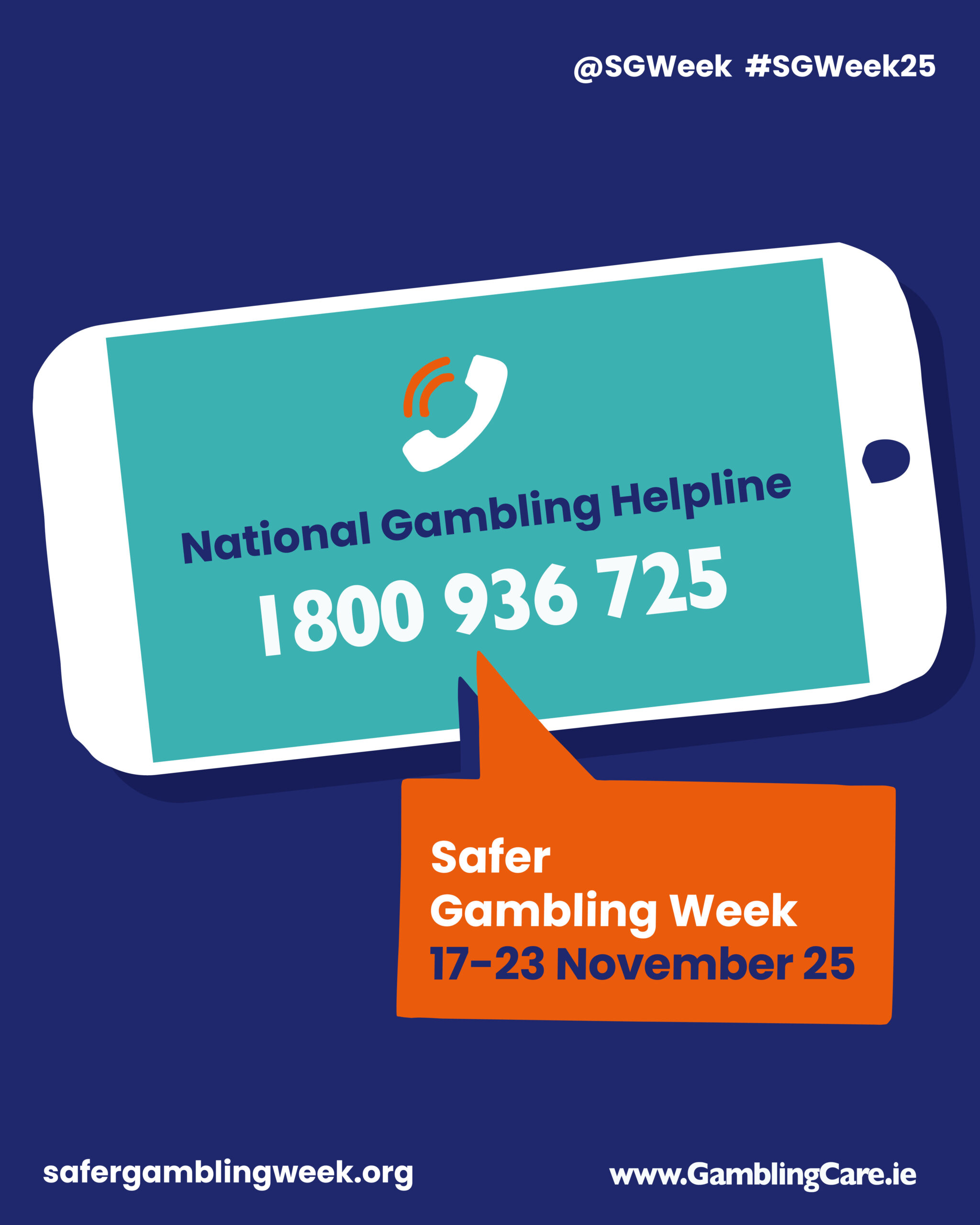 Illustration of a teal smartphone displaying the National Gambling Helpline number, alongside an orange speech bubble with Safer Gambling Week details and dates 17–23 November 2025. Includes @SGWeek, #SGWeek25, and safergamblingweek.org, promoting access to free support and advice during the campaign.